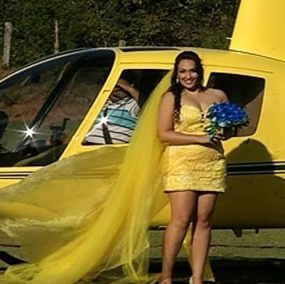 Um casal de An?polis, a 55 km de Goi?nia, aproveitou o clima de Copa do Mundo e celebrou o casamento justamente no dia e hor?rio da estreia do Brasil na competi??o. A ideia da noiva, a advogada Delvanira Bernardo, foi aceita prontamente pelo companheiro, o corretor de im?veis Emerson Pires. Ela chegou para a festa em um helic?ptero amarelo e um vestido da mesma cor para homenagear a Sele??o, que venceu a Cro?cia por 3 a 1.