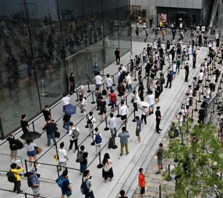 Fila com distanciamento em Pequim, em 17 de julho de 2020 — Foto: Wang Zhao / AFP