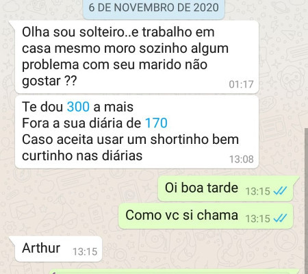 "Mas aí conversando, ele disse que se eu usasse short curtinho, ele pagava mais R$ 300. Eu achei bem constrangedor. Mostrei pro meu marido e ele ficou louco de raiva, indignado", diz a diarista.