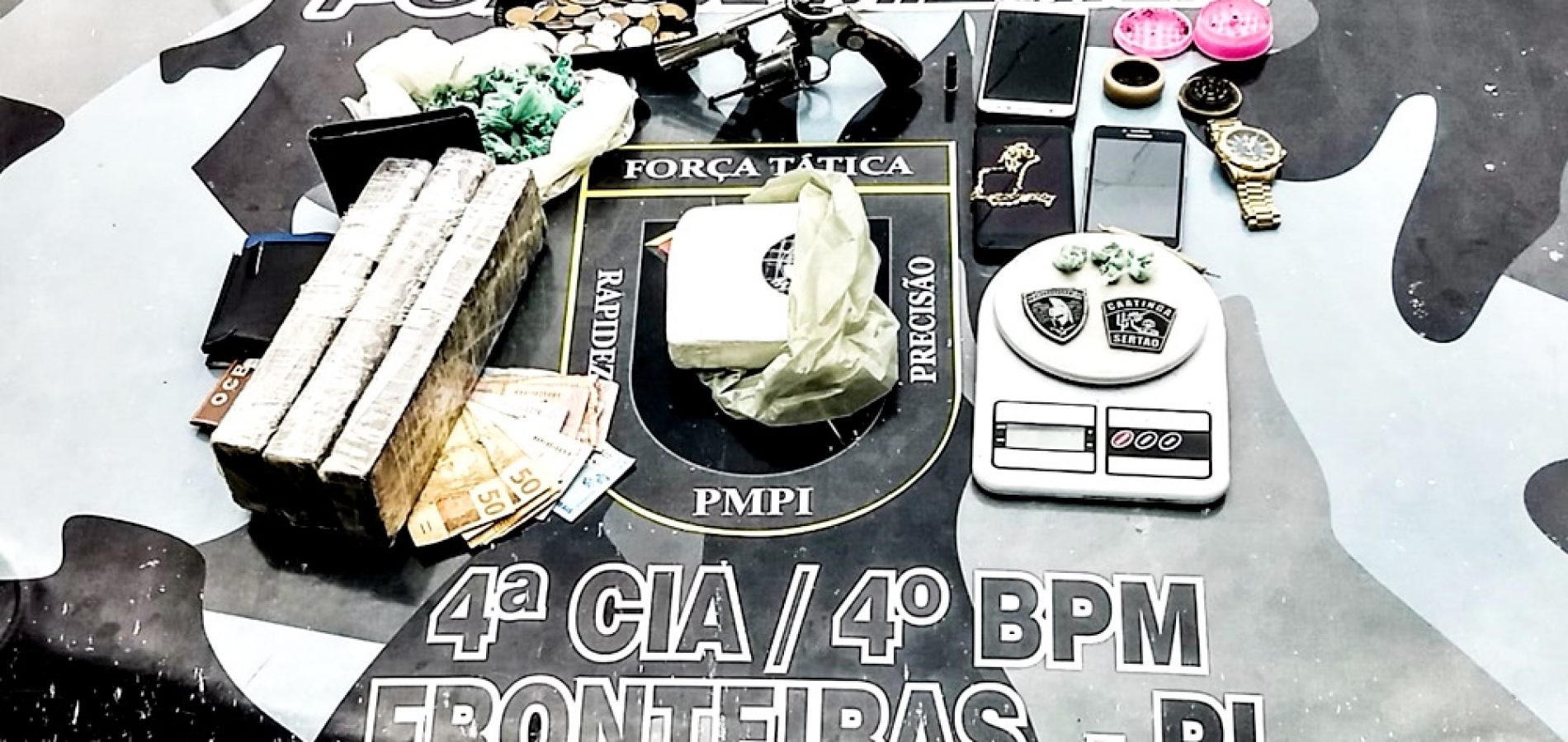 Na ação foram apreendidos 2Kg de maconha, 500g de cocaína, 03 invólucros de crack, 45 invólucros de maconha, 01 cigarro de maconha, 02, triturador de maconha, papel de seda, 01 revólver Rossi cal 32 numeração 113698, 01 munição calibre 32, 01 balança de precisão, 02 aparelhos celulares Samsung, 01 LG k9, 01 corrente folheada a ouro, 01 relógio, R$ 333 reais em cédulas, R$ 42,95 reais em moedas e vasto material para embalagem.