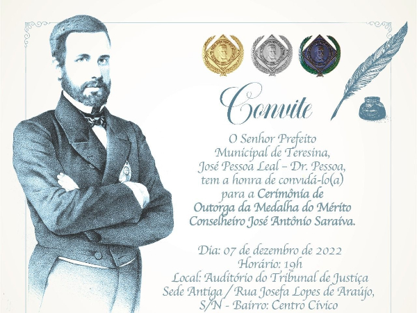 O prefeito de Teresina, Dr. Pessoa, entrega, nesta quarta-feira (7), a Medalha do Mérito Conselheiro Saraiva para 26 personalidades e duas instituições, homenageadas por prestarem relevantes serviços à capital piauiense. A cerimônia de outorga vai acontecer às 19h, no auditório da sede antiga do Tribunal de Justiça do Piauí, no bairro Cabral.