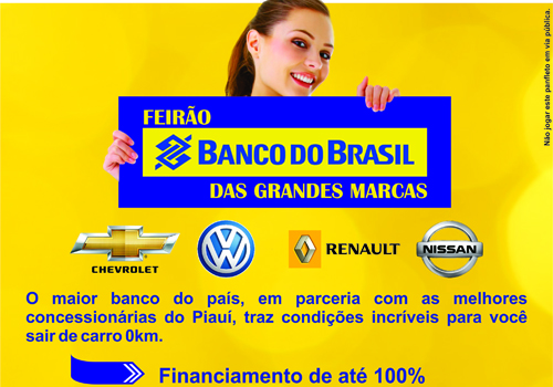 É o Feirão Banco do Brasil das Grandes Marcas, que oferece também financiamento em até 60 meses e primeira parcela para Abril, sem tarifas adicionais. ?Essa é uma excelente oportunidade para quem quer comprar um carro 0km em parceria com o Banco do Brasil?, destaca Djamilson Jose Rodrigues, gerente do Banco do Brasil, acrescentando que o banco disponibilizou colaboradores para todas as concessionárias participantes para agilizar a o envio e aprovação de cadastros.