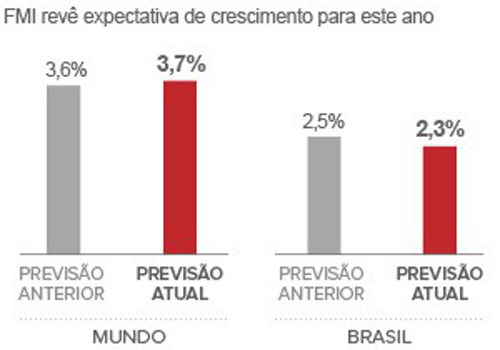 A expectativa para o Produto Interno Bruto (PIB) mundial passou de uma expansão de 3,6%, esperada no relatório de outubro do ano passado, para 3,7%. Já a do Brasil caiu 0,2 ponto percentual, de 2,5% (em outubro) para 2,3%.