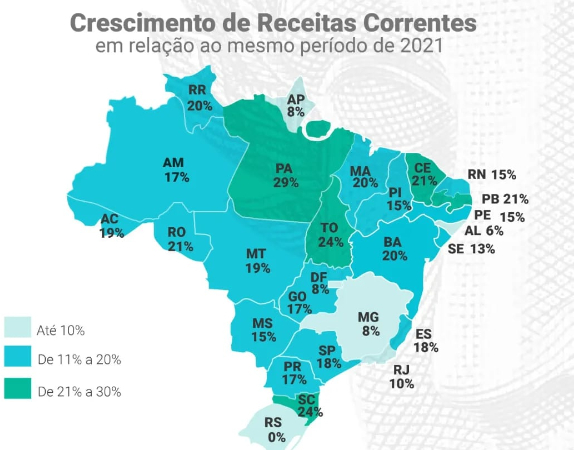 Pará, Santa Catarina e Tocantins lideraram o ranking de estados com maiores crescimentos em suas receitas correntes em relação ao mesmo período de 2021.