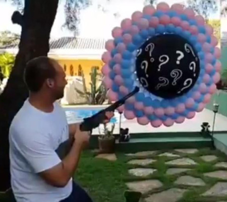 O filho do presidente Jair Bolsonaro (sem partido) atirou em um balão que tinha enfeites cor-de-rosa dentro, revelando que terá uma filha. Não é possível identificar se a arma é de verdade.