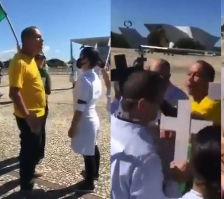 Minutos depois do início da manifestação, um grupo pequeno, que se apresentou como apoiador de Bolsonaro, chegou ao local e começou a gritar com os profissionais.