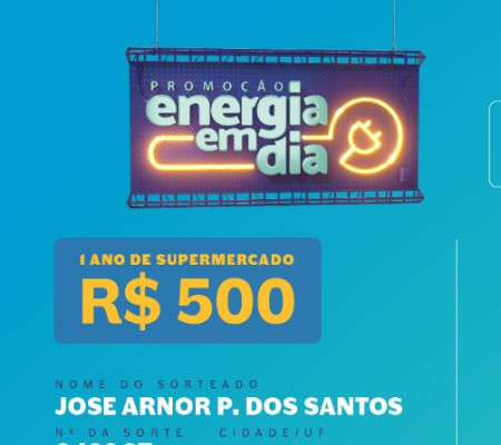 A Equatorial Piauí realizou a apuração dos números da sorte por meio do resultado da Lotomania realizado no dia 26 de fevereiro de 2021 e, após auditoria, apresenta hoje (12), os 04 ganhadores do 8º sorteio da promoção Energia em Dia. Foram novamente sorteados dois clientes para receber um ano de supermercado com valor mensal de R$ 500,00 e mais dois clientes para receberem bônus mensal de R$ 250,00 para pagar a conta de energia por um ano, sendo válido ressaltar que o pagamento pode ser realizado pelo site da distribuidora de forma rápida e fácil, sem precisar sair de casa.