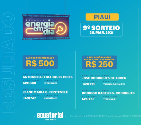 A Equatorial Piauí realizou no dia 26 de março o 9º sorteio da promoção Energia em Dia. Após auditoria, a distribuidora divulgou nesta sexta-feira, dia 09 de abril, os nove ganhadores.