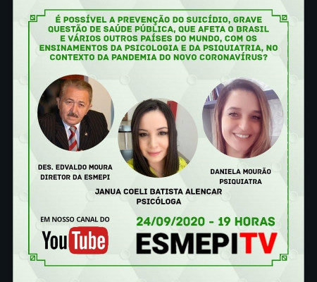 A Escola Superior da Magistratura, sempre empenhada em difundir conhecimentos, ao seu qualificado público-alvo, realizará mais uma de suas lives às 19h desta quinta (24). Desta vez o tema será sobre: É possível a prevençãodo suicídio, grave questão de saúde pública, que afeta o Brasil e vários outros partidos no mundo, com os ensinamentos da psicologia, no contexto da pandmeia do novo coronavírus?