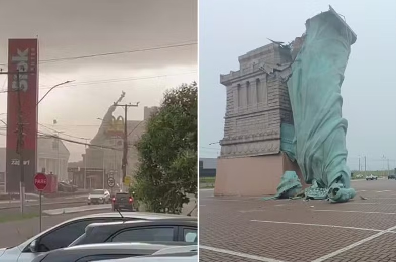Um monumento que simula a Estátua da Liberdade, que fica em frente à loja Havan de Guaíba, na Região Metropolitana de Porto Alegre, desabou durante o temporal que atinge a cidade nesta segunda-feira (15).