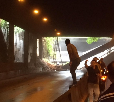 No início da tarde, equipes da Defesa Civil, do Corpo de Bombeiros e da Polícia Militar avaliavam eventuais novos riscos na área do desabamento próximo ao túnel.
