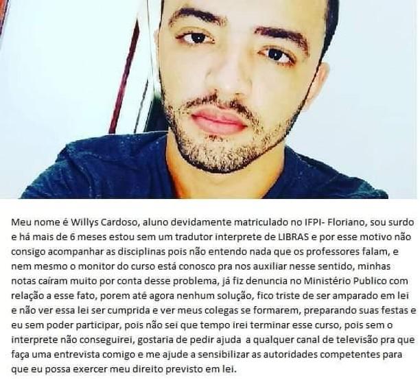 O estudante Willys Cardoso ingressou no curso de Tecnologia em Análise de Sistemas no ano de 2016, no Instituto Federal do Piauí, Campus de Floriano, mas as dificuldades em participar das aulas fizeram com que ele suspendesse os estudos. O motivo é falta de intérpretes de Libras, que, desde 2018, prejudica a garantia de entendimento das aulas.