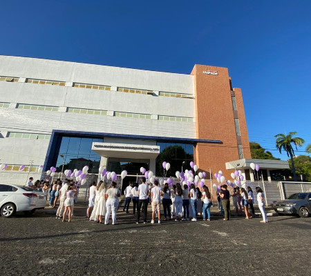 Os estudantes rezaram um terço na porta da faculdade, cantaram a música “Lei da Vida” e, em seguida, soltaram balões de gás hélio nas cores brancas, que significa paz, e roxo, a cor que simbolizava o amor de Kiki com o esposo, Felipe Gomes.