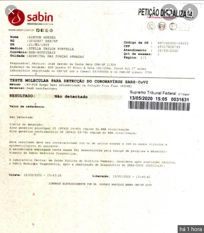 Após determinação da Justiça, o presidente Jair Bolsonaro apresentou os exames para Covid-19. O resultado: negativo. O presidente utilizou os pseudônimos 'Airton', 'Rafael' e '05', mas os números do CPF e RG são verdadeiros. O exame foi realizado no laboratório Sabin, em Brasília.