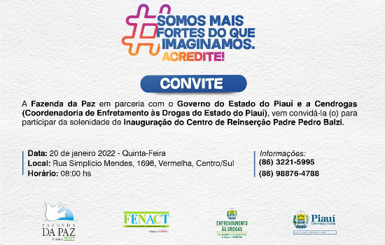 A Fazenda da Paz, juntamente com a parceria do Governo do Estado do Piauí e a Cendrogas (Coordenadoria de Enfrentamento às Drogas do Estado do Piauí), realizará nesta quinta-feira (20), às 8 horas, a solenidade de inauguração do Centro de Reinserção Padre Pedro Balzi.