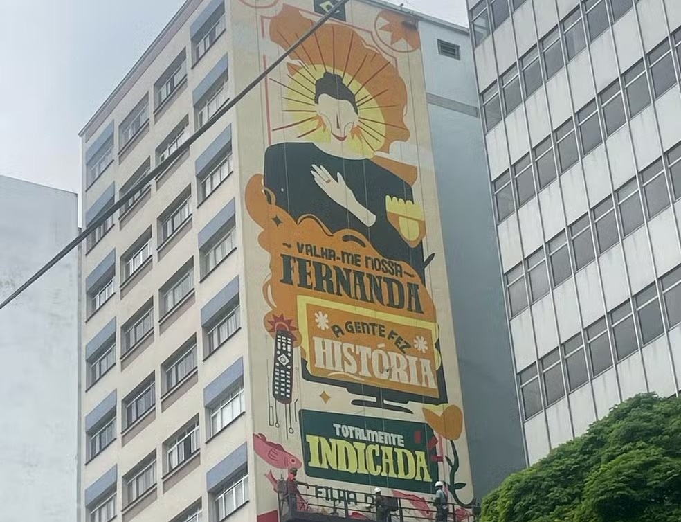 A atriz Fernanda Torres ganhou uma homenagem que quase consegue representar sua grandeza: um mural de 360 metros quadrados na lateral de um prédio de 14 andares na Rua da Consolação, região central de São Paulo.