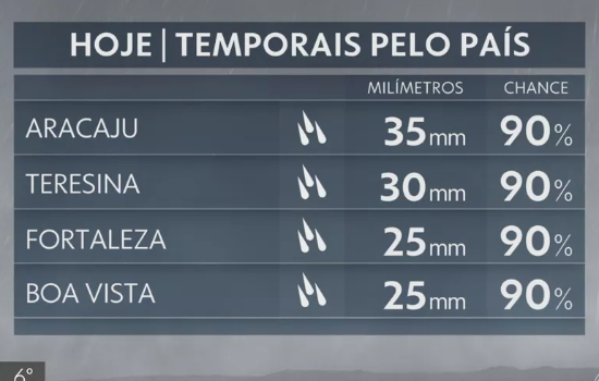 Se em Pernambuco o tempo melhora levemente, já nas capitais de Sergipe, Piauí e Ceará a chuvarada não dará trégua ao longo dos próximos dias. Nesta sexta, choverá pelo menos 35mm em Teresina.