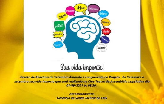 A Fundação Municipal de Saúde (FMS), através da Gerência de Saúde Mental, realiza nesta quarta-feira (1) a abertura do Setembro Amarelo, que é o mês de alusão a prevenção ao suicídio, a partir das 8h30, no Cine Teatro da Assembleia Legislativa. O objetivo da campanha é reforçar a importância dos cuidados com a saúde mental.