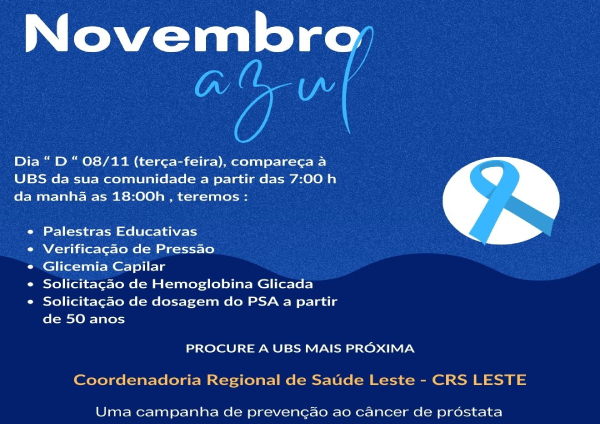A Regional Leste de Saúde realiza nesta terça-feira (08), de 7h às 18h,o Dia D alusivo ao Novembro Azul, em todas as Unidades Básicas da zona Leste. O propósito da campanha é conscientizar à sociedade e, em especial, aos homens, a respeito de doenças masculinas, com ênfase na prevenção e no diagnóstico precoce do cancro de próstata.