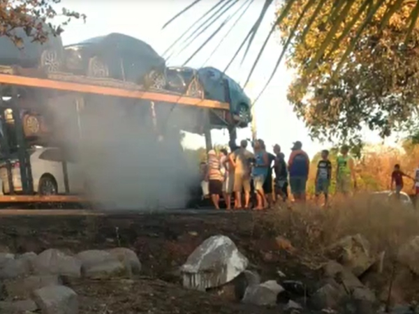 Fogo em caminhão-cegonha é controlado por populares na BR-316 - Imagem: Reprodução/Cidades na Net