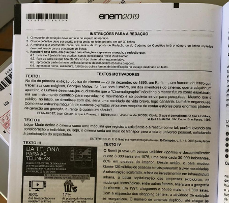 A partir das 15h, usuários passaram a compartilhar no Twitter fotografia da página com textos de apoio que integram a proposta de redação do Enem deste ano, "Democratização do acesso ao cinema no Brasil". Pelo Twitter, o MEC informou que desde as 15h30 já é permitido deixar os locais de prova, mas sem os cadernos.