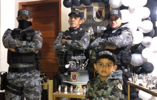 A festinha, preparada pela família do pequeno foi toda no tema, com direito a bolo e decoração nas cores características do grupamento tático. Mas antes dos parabéns, o garoto fez um ensaio fotográfico com os militares, conheceu a viatura e ainda ganhou de presente da família uma miniatura da viatura.