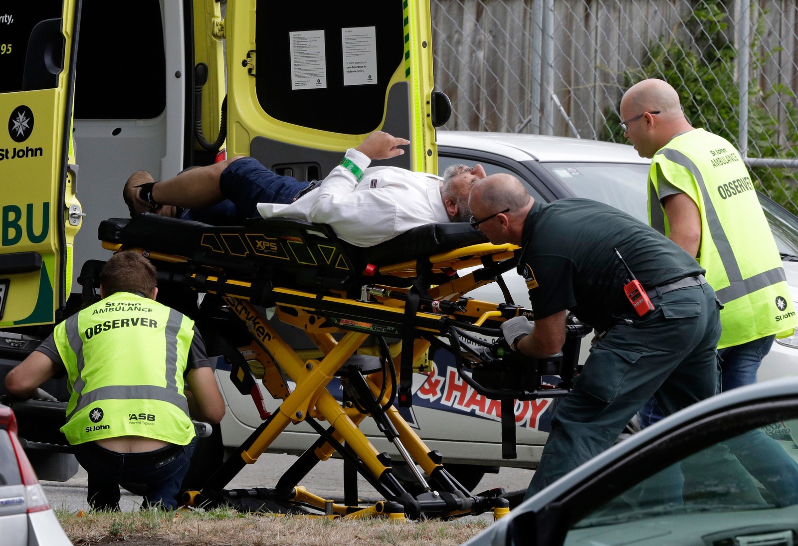 Ferido é socorrido após ataque em mesquita no centro de Christchurch, na Nova Zelândia, nesta sexta-feira (15) — Foto: Mark Baker/ AP
