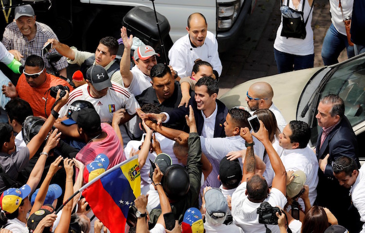 O autoproclamado presidente interino da Venezuela é reconhecido por mais de 50 países como presidente da Venezuela, e saiu do país no dia 23 de fevereiro, para capitanear uma tentativa – frustrada – de envio de ajuda humanitária ao país a partir da fronteira com a Colômbia. Em seguida, partiu para um giro pelo exterior em busca de apoio à oposição ao governo de Maduro.