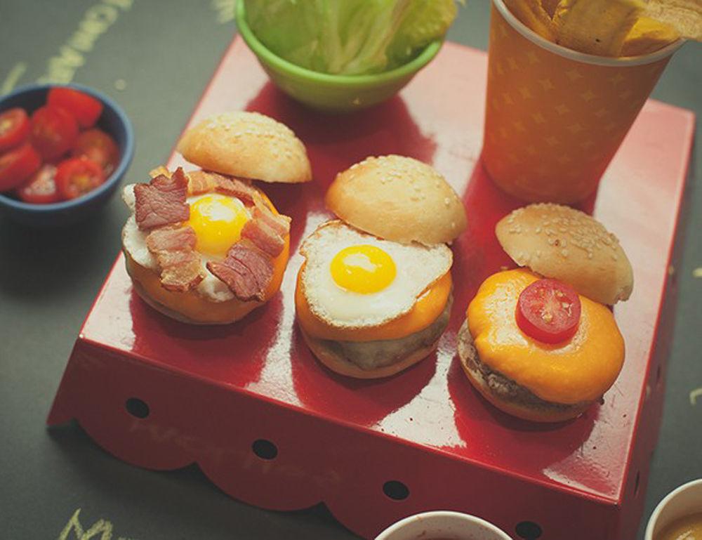 1 Corte os pães de hambúrguer e passe maionese neles. Coloque o hambúrguer com as fatias de cheddar e mozarela, o ovo de codorna, a folhinha de alface americana e o tomate-cereja doce. À parte, sirva o ketchup e a mostarda.