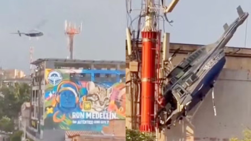 Um helicóptero com seis pessoas a bordo, incluindo turistas, caiu logo após decolar em Medellín, Colômbia. Vídeos mostram a aeronave perdendo controle e colidindo com uma torre de comunicações, ficando presa. Todos sobreviveram, com um dos pilotos ferido.