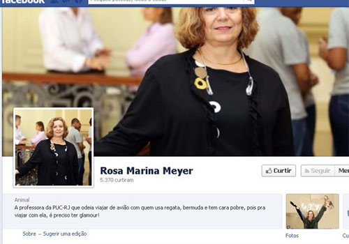 Após a polêmica envolvendo a professora do departamento de letras da Pontifícia Universidade Católica do Rio (Puc-Rio) e diretora da Coordenação Central de Cooperação Internacional (CCCI Puc Rio), Rosa Marina Meyer, uma página foi criada nesta sexta-feira (7), no Facebook, para ironizar a atitude dela ao postar a foto onde criticava os trajes de um homem que vestia camiseta, no Aeroporto Santos Dumont, na Zona Sul do Rio. A descrição da página diz: ?A professora da PUC-RJ que odeia viajar de avião com quem usa regata, bermuda e tem cara pobre, pois pra viajar com ela, é preciso ter glamour." Rosa Marina postou um pedido de desculpas após a polêmica publicação: "Absolutamente não foi essa a minha intenção", disse.