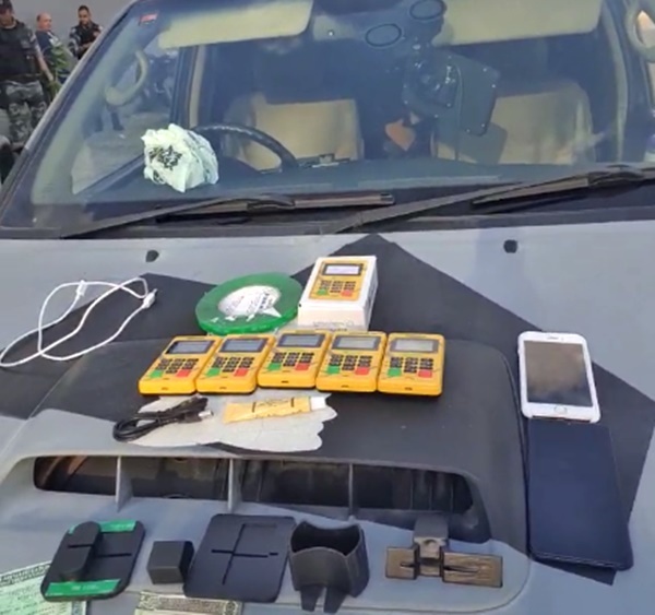 Com o suspeito foi apreendido várias máquinas de cartão, além de cartões em nome de outras pessoas. Todo o material apreendido foi encaminhado para a Central de Flagrante junto com o suspeito para realização dos procedimento legais.