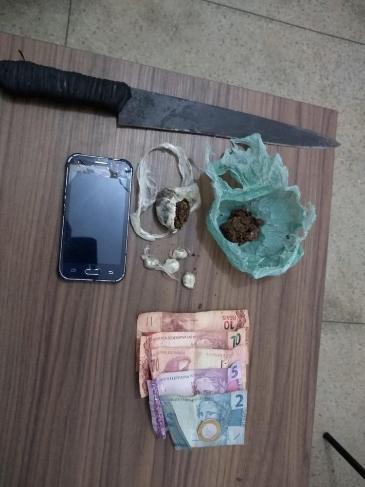 Foram apreendidos em poder do suspeito, um motocicleta modelo Suzuki 125 YES, seis porções de maconha, um aparelho de telefone celular, uma faca e uma pequena quantia em dinheiro.