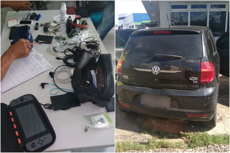 Com o criminoso foi encontrado um video game nitendo switch com 12 jogos, um vídeo game nitendo 3D, três carregadores para celulares, três fones de ouvido, um mouse, uma necessaire com pergume e barbeador elétrico, um HD externo, um DVD, um carregador de notebook, uma mochila preta swiss win, um crachá de identificação do Hospital Universitário e um outro crachá do Hospital São Marcos em nome do médico.