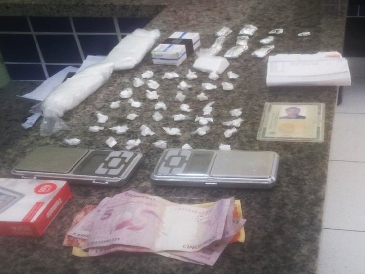 O responsável pela residência informada pelo indivíduo abordado, Sebastião da Conceição Teodoro, de 34 anos, se apresentou e permitiu a entrada dos policiais, que fizeram uma revista. Foi encontrada uma sacola com nove porções de maconha, uma porção prensada, 38 porções de cocaína, R$ 50,00 em dinheiro trocado.