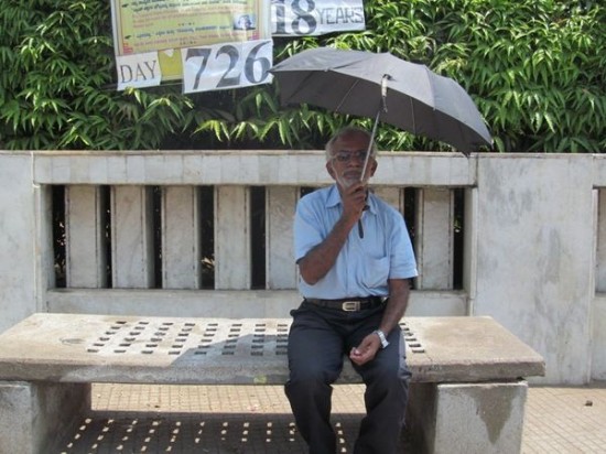 Todas as manhãs, o velho franzino vai para o mesmo banco do lado de fora do Parque Mahatma Gandhi, em Bangalore, apenas com um guarda-chuva e jejua em protesto contra o Governo por ter ?roubado? sua terra.