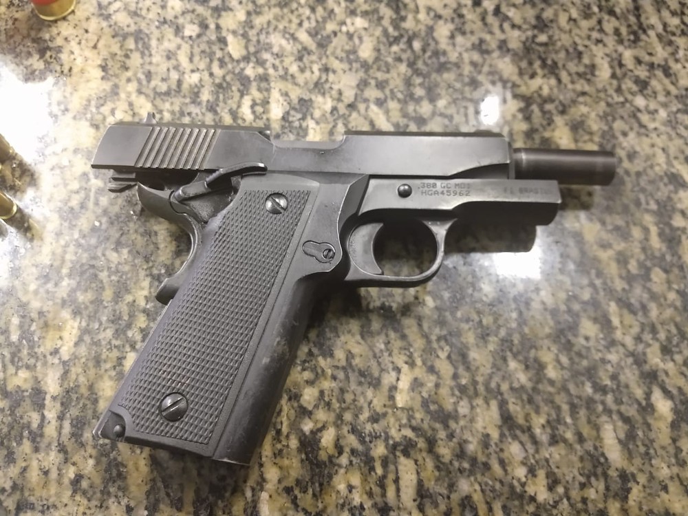 O homem acabou levado ao plantão da Delegacia Sede da cidade, onde prestou depoimento. Durante a madrugada, porém, um vizinho encontrou no telhado da casa uma sacola, com uma pistola calibre 380 com um carregador, além de cinco munições de calibre 12, sete de calibre 380, e 17 de calibre 38.