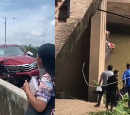 Quando chegou na altura da ponte, ele colidiu em alta velocidade em uma das alças do local, saiu do veículo e por medo de ser agredido, se jogou. “Ele bateu lá na Piçarra, o motoqueiro veio seguindo ele. Desesperado ele bateu o carro e depois se jogou da ponte. Samu tá chegando aí. O cara desesperado, sem pensar”, disse uma pessoa que viu toda a situação.