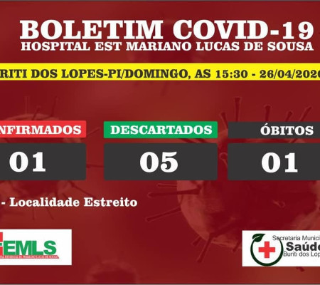 A Secretaria Municipal de Saúde e o Hospital Mariano Lucas de Sousa confirmam hoje, 26/04, uma morte por coronvaírus no município de Buriti dos Lopes. Uma mulher de 70 anos da localidade Estreito, faleceu no Hospital Estadual Dirceu Arcoverde, em Parnaiba. Comunicamos que todas as providências estão sendo realizadas em relação ao isolamento social da família e outras medidas necessárias.