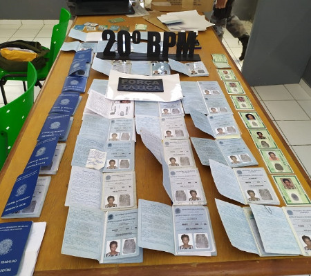 Durante a verificação, documentos com indícios de falsificação foram encontrados com a idosa, de 64 anos, seis Carteiras de Identidade (RG) e 26 Carteiras de Trabalho e Previdência Social com a sua foto, mas com qualificações diversas. Com o outro idoso, de 83 anos, foram encontrados 10 Carteiras de Trabalho e Previdência Social com a sua foto e qualificações diversas. No interior do veículo, também foi encontrado impressora, notebook, carimbos, celulares, papel para confecção de documentos e diversos comprovantes de saques de benefícios do INSS.