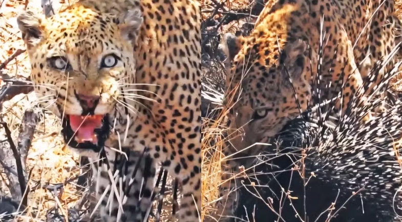 Mesmo ferido, o leopardo não desistiu da presa. Conseguiu matar o porco-espinho, mas não sem consequências. Com o corpo ensanguentado e o rosto cravado de espinhos, o felino passou vários minutos tentando se livrar dos fragmentos antes de finalmente conseguir se alimentar.