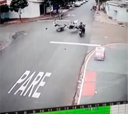Imagens registradas por câmeras de segurança gravaram uma colisão envolvendo três motocicletas, com quatro pessoas feridas, na zona norte de Ribeirão Preto (SP). O acidente aconteceu no último sábado (4) no Jardim Jandaia. As informações são do G1.
