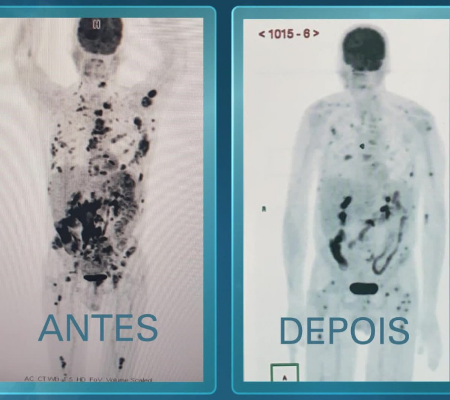 Exames feitos com pouco mais de um mês de diferença mostram a remissão de um linfoma em fase terminal no mineiro Vamberto Luiz de Castro, 64 anos, que recebeu tratamento inédito na América Latina, baseado em uma técnica de terapia genética descoberta no exterior e conhecida como CART-Cell.