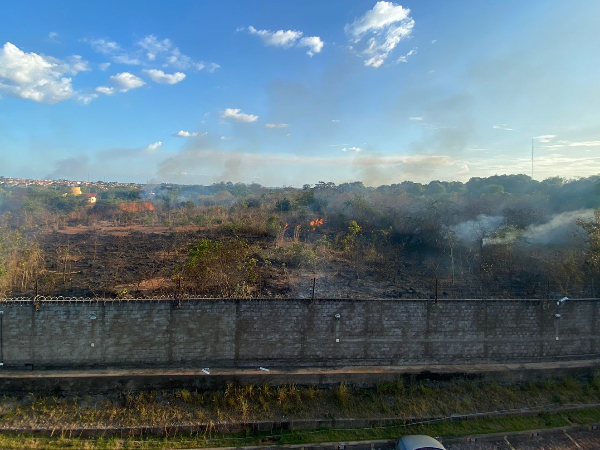 A área apresenta uma vegetação seca, que pode ter facilitado a propagação das chamas, que atingiu o muro do condomínio e queimou a cerca elétrica.