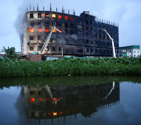 As chamas atingiram uma fábrica de alimentos e bebidas da Hashem Foods Ltd. em Rupganj, perto da capital Daca, na tarde de quinta-feira (8).