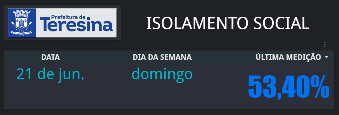 Segundo levantamento feito pela Prefeitura de Teresina, por meio da Startup InLoco, a cidade registrou neste domingo (21) o índice de 53,40% de isolamento social, dia em que o Governo do Estado adotou lockdown parcial. As medidas de distanciamento pretendem diminuir a taxa de contaminação do novo coronavírus, que já atingiu a marca de 5856 casos confirmados da doença e 281 óbitos na capital.