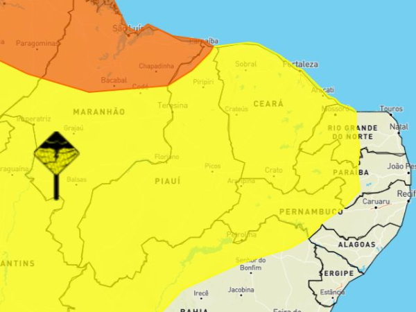 Já o alerta laranja (alto grau de perigo) compreende o norte piauiense, em especial o litoral. Nessas áreas, pode chover entre 30 e 60 mm/h ou 50 e 100 mm/dia, com ventos intensos (60-100 km/h). Há risco de corte de energia elétrica, queda de galhos de árvores, alagamentos e de descargas elétricas.