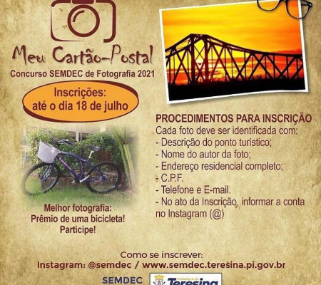 As inscrições para a 1ª Edição do concurso fotográfico, “Meu Cartão-Postal”, encerram neste domingo (18). O concurso que é promovido pela Prefeitura de Teresina, por meio da Secretaria Municipal de Desenvolvimento Econômico e Turismo (SEMDEC), premiará o melhor registro de algum ponto turístico da capital.