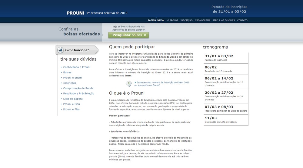 O candidato precisa ter feito o Enem 2018 e não pode ter um diploma do ensino superior. Também necessita se enquadrar em um dos seguintes critérios de renda: