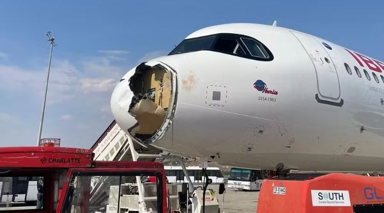 A aeronave, um Airbus A320, havia acabado de decolar do Aeroporto de Barajas, na capital espanhola, quando foi atingida. De acordo com o jornal El País, a tripulação decidiu retornar imediatamente ao terminal, e o pouso foi realizado com segurança.